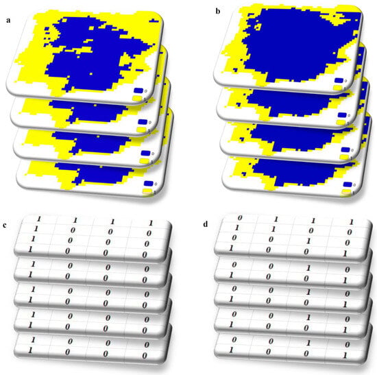 Schematic representation of overlapping binary suitability maps of plants (a,c) and pollinators (b,d).