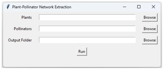 For this, we developed a Python program that requires two folders containing binary distribution maps for plants and pollinators separately. It automatically extracts the names of plants and pollinators and creates matrices with rows representing plants and columns representing pollinators. These matrices capture potential interactions by assigning ‘0’ where there is no overlap between a plant and a pollinator and ‘1’ where their ‘1’ cells coincide. The code generates separate CSV files, each representing a matrix for every cell, enabling users to review and remove files without any interactions between plants and pollinators. This program has a user-friendly graphical interface (Figure 3) to facilitate its usage. The program’s code (Python 3.12) is available as a TXT file on GitHub (https://github.com/ehsanrahimi666/SDM.git, accessed on 1 October 2024), allowing users to review and modify it as needed. To utilize the program, users simply need to copy the code into a Python script and execute it.