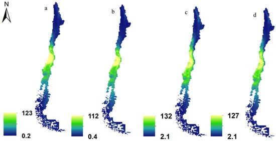 In our research, we employed the “FLEXSDM” R package [77] to model the distribution of the species under investigation. Utilizing the MaxEnt model, we generated climate suitability maps by integrating presence data with climate information. To facilitate the modeling process, we created 5000 random pseudo-absence points, which were utilized alongside the presence points in Chile within the MaxEnt model. In this study, we categorized the climate suitability map into two classes: low and high suitability. The high-suitability class encompassed values exceeding 0.6 [78] or 0.7 [21,61]. Therefore, the threshold in this study was selected based on expert opinion, with guidance from previous studies. We focused our analysis solely on the range changes within the high-suitability class. To calculate the percentage of change, we employed the following formula: