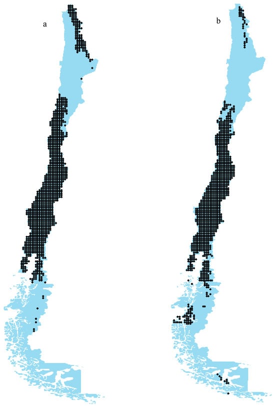 Network location of plant–pollinator networks in current (a) and future (b) (SSP585, 2070) scenarios in Chile (cell size = 1 km2). The blue color indicates regions lacking networks, while each black dot represents a network.