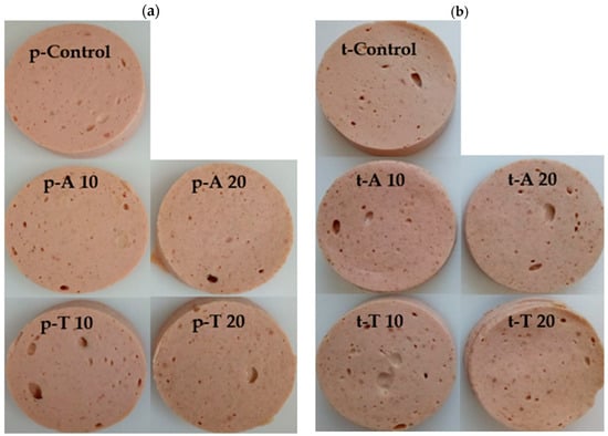 Images of the pork cooked sausages (a) and turkey cooked sausages (b) after cooling and slicing. p/t-: pork or turkey cooked sausages; control: without insect larvae powder (top); center, left to right—p/t-A 10/-A 20 consisted of 10%/20% pulverized Alphitobius diaperinus larvae; bottom, left to right—p/t-T 10/-T 20 consisted of 10%/20% pulverized Tenebrio molitor larvae.