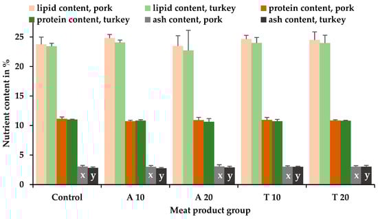 Mean and positive standard deviation values of the fat, protein, and ash contents of the different cooked sausages (in % of the fresh/original substance) on storage day 0 depending on the meat product group and the meat source (pork versus turkey meat). Meat product groups: control (without insect powder); A 10/A 20, consisting of 10%/20% pulverized A. diaperinus larvae; T 10/T 20, consisting of 10%/20% pulverized T. molitor larvae. xy bars with different letters between the animal meat sources (N = 6) (pork and turkey meat) within the same insect species were significant (p ≤ 0.05).