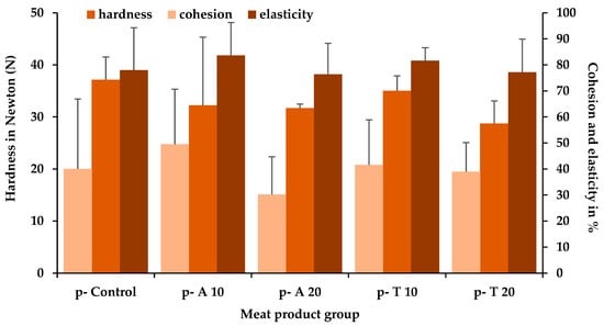 Mean and positive standard deviation values of the texture profile analysis of the pork cooked sausages after cooking depending on the meat product group: p-control (without insect powder); p-A 10/-A 20, consisting of 10%/20% pulverized A. diaperinus larvae; p-T 10/-T 20, consisting of 10%/20% pulverized T. molitor larvae.