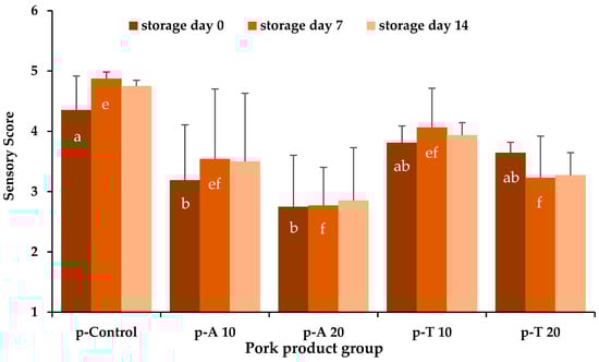 With regard to the impact of the insect species on the a* values, on storage day 7, all pork products differed significantly (p S ≤ 0.05) from each other, with p-control having the highest a* value, followed by the T. molitor products and the sausages containing A. diaperinus. In contrast, regarding the turkey products on storage day 7, control products had only significantly higher (p S ≤ 0.05) a* values than turkey products containing A. diaperinus (p S ≤ 0.05). The a* results of the sausages with T. molitor did not differ significantly (p S > 0.05) from those of the other groups. On storage day 14, pork and turkey meat control sausages had significantly higher (p S ≤ 0.05) a* values than the corresponding insect products independent of the insect species (Table 6). Furthermore, on storage days 7 and 14, considering the factor concentration, p-control showed significantly higher (p C ≤ 0.05) a* values (p C ≤ 0.05) than 10% and 20% pork insect products, whereby the a* results of the groups containing 10% and 20% powder did not differ significantly (p C > 0.05) from each other. In contrast, on storage day 7, t-control had significantly higher (p C ≤ 0.05) a* values than 20% turkey–insect products, but products containing 10% insects differed not significantly (p C > 0.05 from t-control and the 20% insect sausages. Like in the pork products on storage day 14, a* values in t-control were significantly higher (p C ≤ 0.05) compared to the products with 10 and 20% insect larvae (Table 6).