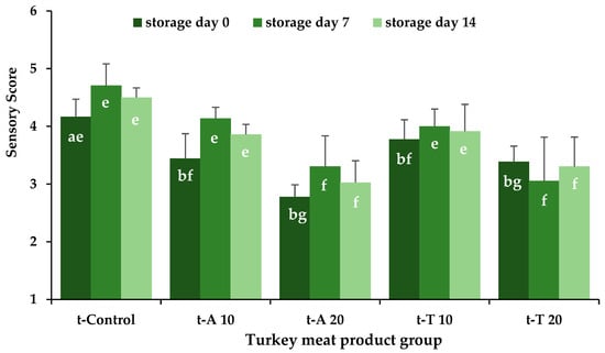 On storage days 0, 7, and 14, the non-inoculated packages were observed from the outside and the sausage slices were rated from a scale from 1 to 5 in relation to their appearance (modified test from the German Agricultural Society, DLG). No deviations were rated with 5 points, minor deviations with 4 points (expert recognizes differences), moderate deviations with 3 points (average consumer recognizes differences with high probability), significant deviations with 2 points (layperson recognizes deviations in the product), and severe deviations with 1 point (not fit for consumption). After that, the packages were opened and appearance and odor were immediately evaluated, again referring to the described 1-to-5 scaling. The sensory analysis was carried out by three trained persons. As the appearance has a higher impact on the consumer’s buying decision, the appearance was more considered. The total sensory analysis was calculated by multiplying the appearance average of the three persons with 3 and the odor average with 1. This result was divided by 4 to achieve a final sensory score value between 1 and 5.