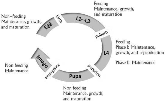 A variety of typified models were derived from DEB theory to incorporate the complexities of the various species’ life stages []. The majority of insect species are modeled using the h-models, which assume metabolic acceleration [] for part of their life cycle; a cease of growth after emergence; filling the reproduction buffer in the last feeding stage before emergence since the imago’s diet typically lacks macro-nutrients and in some cases they do not eat at all; and include the pupa stage for holometabolous insects []. The proposed model for C. riparius is based on the “hax” model [], with some modifications which are explained below. Table 1 provides a summary of the model equations, while detailed descriptions are available in Tables S4 and S5 of the Supplementary Materials.