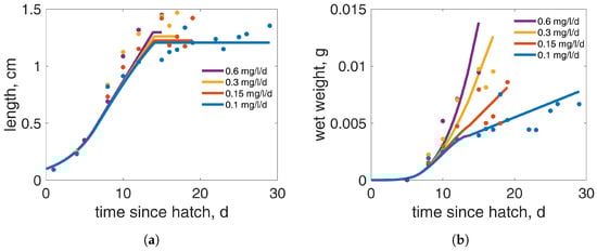 Growth data (points) and model predictions (lines) presented as length (a) and weight (b) for different feeding TetraMin concentrations (each presented with different colors). Data are from the current study. The experiments were conducted at a constant temperature of 21 °C.