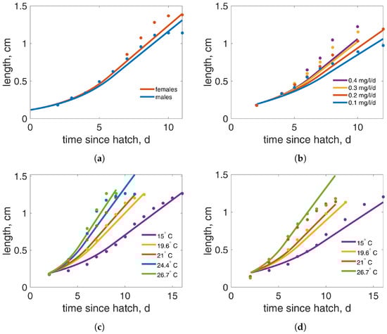 Length-at-age data (points) and model prediction (lines) for (a) males and females, (b) different TetraMin concentrations, (c) different temperatures under ad libitum food, and (d) different temperatures under food limitation. Data source: (a,b) [] and (c,d) []. The experiments in (a,b) were conducted at a constant temperature of 21 °C.