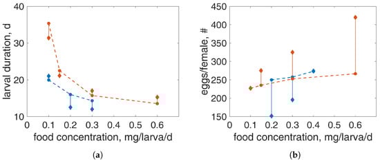 Data (diamonds) and model predictions (circles) for larval duration (a) and number of eggs/female (b) at different TetraMin concentrations. Vertical lines indicate the error between data and predictions. Data source: current study (orange, (a,b)), [] (blue, (a)), and [] (blue, (b)). In all experiments, temperature was 21 °C.