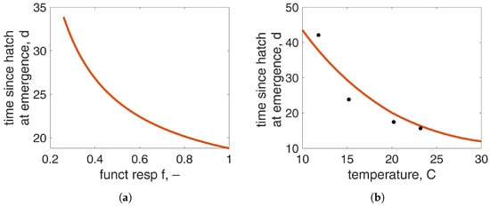 Time since hatch at emergence as function of (a) scaled functional response (at 20 °C) and (b) temperature (with ). The dots represent data from [], which are not used in the parameter estimation.