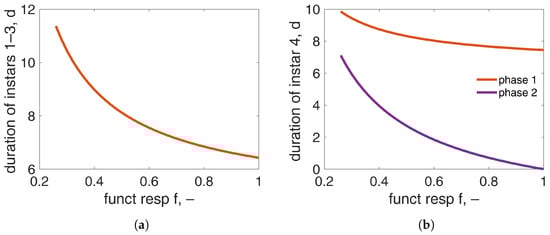 (a) Duration of the first three instars and (b) duration of Phase I (orange) and Phase II (purple) of the fourth larval stage (at 21 °C) as a function of scaled functional response.