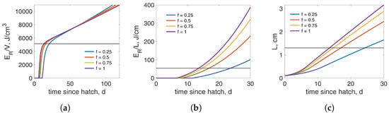 Studies in Chironomidae have shown that females need this excess energy to extend their life span while males expand their duration of flight, both increasing the chances of successful reproduction [,]. As pointed out in [], requiring the reproduction reserve density to achieve a specified value helps to ensure a critical mass of the organism at pupation. However, this trigger does not take into account the energy in the general reserve. Incorporating the two triggers ensures sufficient energy for successful pupation, metamorphosis, survival, and reproduction. Strandberg et al. [] observed that the proportion of n–6 polyunsaturated fatty acids (PUFAs), which are linked with the regulation of metabolism and the reproductive system [], were almost independent of the diet. This observed pattern resembles the assumption of the biphasic L4 instar growth, where both the reserve and reproduction reserve density are the same at pupation under all feeding levels. However, the growth is still affected, as shown in Figure 2, Figure 3 and Figure 7a.