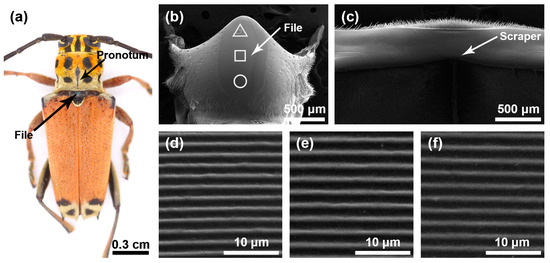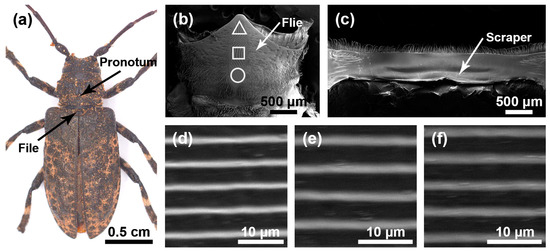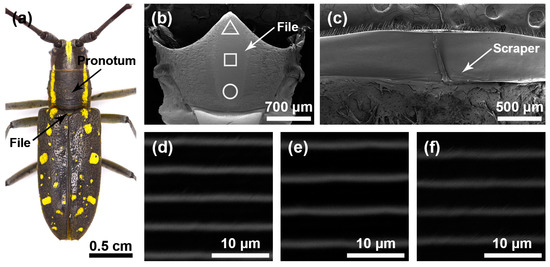 Stridulatory organs of Moechotypa diphysis. (a) Pronotum and file of Moechotypa diphysis female. (b) The overall structure of the file. (c) The overall structure of the scraper that is located on the inner surface of the pronotum. (d) Magnified view of the front part of file (triangle). (e) Magnified view of the center part of file (square). (f) Magnified view of the rear part of file (circular).