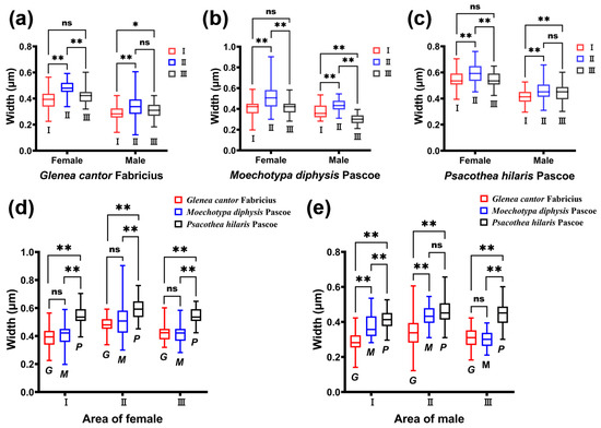 Comparison of the width of the ridges of three species of longhorn beetles. (a) Comparison of the width of ridges in different areas of Glenea cantor females and males. (b) Comparison of the width of ridges in different areas of Moechotypa diphysis females and males. (c) Comparison of the width of ridges in different areas of Psacothea hilaris females and males. (d) Comparison of the width of ridges in the same area in three female longhorn beetles. (e) Comparison of the width of ridges in the same area in three male longhorn beetles. Ns, No significant difference between sexes by the Kruskal–Wallis test. *, Significant difference between sexes at the 0.05 level as determined via the Kruskal–Wallis. **, Significant difference between sexes at the 0.01 level as determined via the Kruskal–Wallis test.