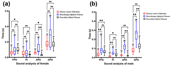 We compared the PPD, PI, APD, and PGD between male and female adults of the three species of longhorn beetles (Table 2). There were significant differences in the four durations between male and female adults of G. cantor, no significant differences between male and female adults of M. diphysis, and significant differences in the three durations between male and female adults of P. hilaris (Table 2). Except that the APD of males of M. diphysis was longer than that of females and PI of males of P. hilaris was longer than that of females, the duration of females was longer than that of males at other types of time.