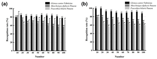 For the recognition of the sound of longhorn beetles, LPCC and MFCC were used to extract the features of the sound of longhorn beetles, and the recognition model used was SVM. As the number of samples to be tested increased from 10 to 100, the recognition rates of the three longhorn beetle sounds were also changed (Figure 7). Using the LPCC and SVM method for recognition (Figure 7a), the average recognition rate of G. cantor was 82.6%, the average recognition rate of M. diphysis was 74.4%, and the average recognition rate of P. hilaris was 65.9%; using the MFCC and SVM method for recognition (Figure 7b), the average recognition rate of G. cantor was 92.5%, the average recognition rate of M. diphysis was 73.6%, and the average recognition rate of P. hilaris was 62.6%. Although the recognition results of M. diphysis and P. hilaris using the MFCC and SVM method were lower than those of the LPCC and SVM, the overall recognition effect of the combination of MFCC and SVM was better.