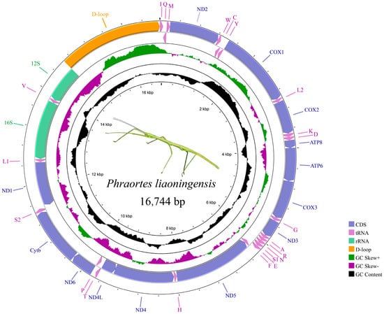 Insect mitogenomes are composed of a double-stranded circular structure ranging from 15 to 18 kb that encode 37 genes and are characterized by high replication rates, rapid evolutionary speed, and a conserved structure, which makes them excellent molecular markers for analyzing deep phylogenetic relationships [33,34,35]. With the rapid advancement in sequencing technologies, insect mitogenomes have been extensively reported and have become increasingly popular in phylogenetic studies, resolving numerous taxonomic issues [36]. As of July 2024, 57 mitogenomes of the Phasmatodea have been published by the National Center for Biotechnology Information (blast.ncbi.nlm.nih.gov/Blast.cgi, accessed on 1 July 2024), covering nine families of species. Compared to the species richness of this order, the mitogenome database of this group still requires further enrichment.