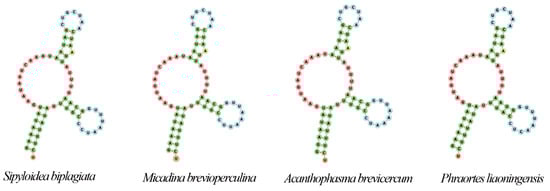 Figure 2. Secondary structure of trnS1 in Sipyloidea biplagiata, Micadina brevioperculina, Acanthophasma brevicercum, and Ph. liaoningensis. The DHU arm of the trnS1 secondary structure was lost in these species.