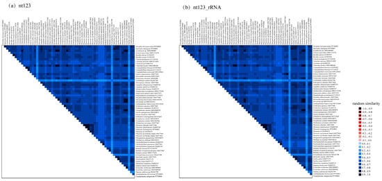 Figure 3. Sequence heterogeneity analyses of nt123 and nt123_rRNA datasets, color depth indicates the level of random similarity.