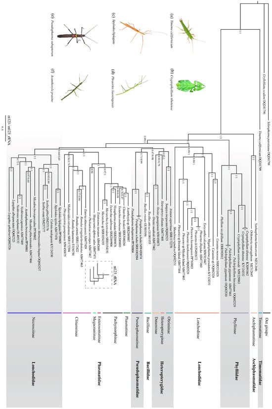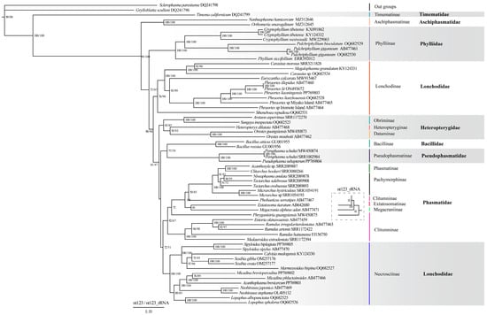 70. Li, Y.; Wang, S.; Zhou, J.; Li, T.; Jiang, K.; Zhang, Y.; Zheng, C.; Liang, J.; Bu, W. The phylogenic position of aschiphasmatidae in euphasmatodea based on mitochondrial genomic evidence. Gene 2022, 808, 145974. [Google Scholar] [CrossRef]
