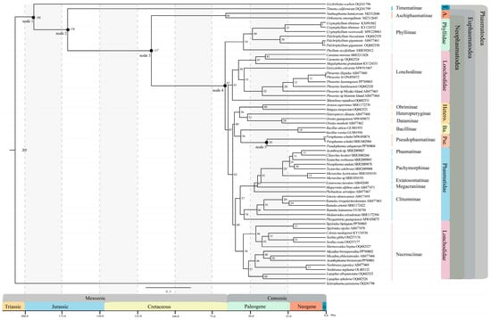 According to the comprehensive phylogenetic analysis conducted by Misof et al. [10], insects originated during the early Ordovician period, approximately 479 million years ago (Mya). Fossils provide crucial information about ancient organisms and can help calibrate the nodes (branching points) of the phylogenetic tree [37]. These calibrated nodes serve as time references, allowing researchers to estimate when specific evolutionary events occurred. Owing to the scarcity of precise time estimates and the ambiguous taxonomic status of fossils, the origin and diversification timeline of Phasmatodea has remained an unresolved enigma to date. Based on the results of previous research, the origin time of the Phasmatodea is approximately between the Triassic and Cretaceous periods. Using two fossil calibrations, Buckley et al. [3] estimated the origin of Phasmatodea to be approximately 95 Mya during the Cretaceous period, with the diversification of Euphasmatodea occurring around 51.9 Mya. Similarly, using four fossil calibrations, Bradler et al. [38] proposed an origin of Phasmatodea at 104 Mya, and Euphasmatodea was suggested to have emerged around 80.3 Mya. In addition, based on transcriptome data, Simon et al. [23] employed five fossil calibrations with results that supported that extant Phasmatodea began to diverge approximately 121.8 Mya. During the Cretaceous, the emergence and reproduction of various flowering plants formed a wide variety of plant morphology and structure [39,40,41]. Increased plant diversity can provide new ecological niches and resources for Phasmatodea. Recent studies have generally leaned towards an earlier origin for Phasmatodea. Tihelka et al. [42] provided support for the split between Timema and Euphasmatodea during the Triassic period. Forni et al. [14] traced the origins of stick and leaf insects back to the middle Permian period, approximately 273.8 Mya. Additionally, in the divergent time tree constructed by Bank et al. [18], the origin of Phasmatodea occurred in the Jurassic period, around 178.56 Mya. In 2022, Ghirotto et al. [43] counted and sorted ninety-five Phasmatodean fossils and proposed that Araripephasma reliquum is the oldest known Euphasmatodea fossil, with an estimated age of 115 Mya. Considering this perspective, the origin and diversification of Euphasmatodea may have occurred earlier. To gain insights into the origin of the Phasmatodea, accurate fossil node calibrations and a robust phylogenetic tree are crucial in inferring the timing of evolutionary events.