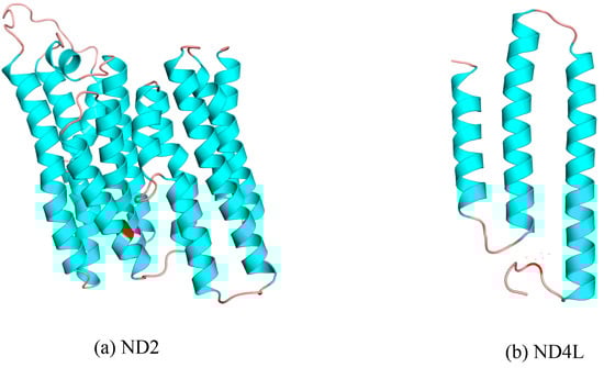 Figure 7. The protein secondary structure of ND2 and ND4L from Ph. liaoningensis was predicted by SWISS-MODEL, and the corresponding selection sites are marked in red.