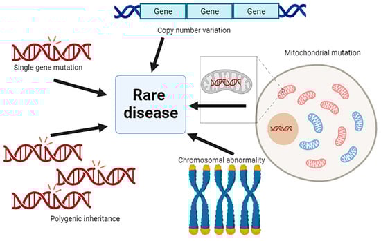 Schematic representation of the genetic alterations that cause rare diseases. Single gene mutations cause genetic aberrations in the DNA sequence of a specific gene. Copy number variation (CNV): the sequences of the genome are repeated. Mitochondrial mutations, the DNA contained in the mitochondria (mtDNA) is mutated. Chromosomal abnormality, the morphology or the number of chromosomes is altered. Polygenic inheritance, more than one gene is mutated. Image generated in BioRender.com (10 October 2024).