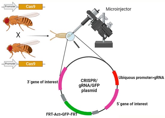 Each component of the CRISPR/Cas9 system has to be present in the same cell to produce the reaction. There are several possibilities from injecting all components in the embryo, or on the contrary, to generate stable transgenic flies and cross them (reviewed in []). In our hands, to generate rare disease avatars, our aim is to reproduce point mutations in conserved genes; thus, the optimal strategy is to inject a DNA plasmid containing the gRNA and the specific donor sequences in embryos from a transgenic line expressing Cas9 in the germ line (Figure 2).
