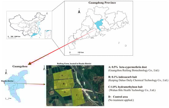 This experiment was conducted in an orchard habitat in Huadu district, Guangzhou, Guangdong Province, targeting multi-queen colonies of the red imported fire ants (RIFA). On the day of the experiment, the ambient temperature ranged from 22 °C to 32 °C, with a relative humidity (RH) of 75%. Prior to treatment, the RIFA infestation in both the control and monitoring areas was assessed through visual inspection and baiting methods. For the occurrence level of RIFA, we referred to the Guidelines for Quarantine Surveillance of Solenopsis invicta Buren, following the protocol (GB/T 23626-2009) [], as follows.