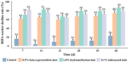 The control effects of three pesticides on RIFA worker ants. The values in the histogram represent the mean ± standard error. Following a one-way analysis of variance (Tukey), identical capital letters indicate no significant difference (p > 0.05) between treatments with the same pesticide at different time points. Meanwhile, identical lowercase letters denote no significant difference (p > 0.05) between different pesticides at the same time point.