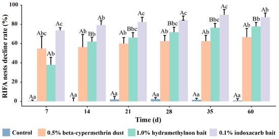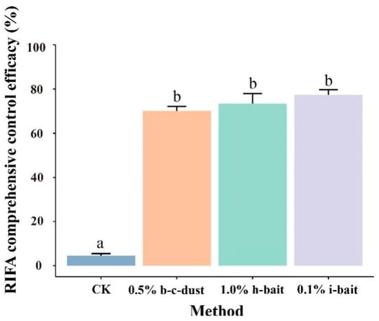 The experimental results demonstrate that the comprehensive control effects of 0.5% beta-cypermethrin dust, 1.0% hydramethylnon bait, and 0.1% indoxacarb bait on RIFAs after 60 days of treatment were 70.12%, 73.40%, and 77.36%, respectively (Figure 5). Although there were no significant differences in the comprehensive control effects between the three pesticides, all treatments were significantly more effective than the control treatment (p < 0.05).