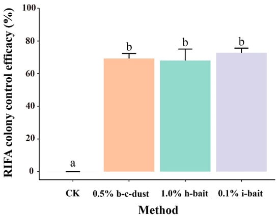 Comprehensive control effects of three pesticides after 60 days of treatment on RIFA. The 0.5% c-dust represents 0.5% beta-cypermethrin dust, 1.0% h-bait represents 1.0% hydramethylnon bait, and 0.1% I-bait represents 0.1% indoxacarb bait. The values presented in the histogram represent the means ± standard errors. The data were analyzed using a one-way analysis of variance (ANOVA) with the Tukey method. Bars with the same lowercase letters indicate no significant difference between the different pesticide treatments (p > 0.05).