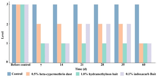 Impact of different treatments on RIFA occurrence levels over a 60-day period. The treatments included a control group, 0.5% beta-cypermethrin dust, 1.0% hydramethylnon bait, and 0.1% indoxacarb bait. According to the quarantine surveillance guidelines for S. invicta (GB/T 23626-2009) [], RIFA occurrence levels were categorized as follows: Level I (Light)—an average of fewer than 20 workers per monitoring bait; Level II (Moderate)—an average of 20.1 to 100 workers per monitoring bait; and Level III (Moderately Heavy)—an average of 100.1 to 150 workers per monitoring bait.