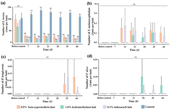 Dynamic changes in ant species (baiting trap). (a) Number of Solenopsis invicta, (b) Number of Tapinoma melanocephalum, (c) Number of Paratrechina longicornis, (d) Number of Polyrhachis dives. The data in the figure represent the means ± standard errors. Following a one-way ANOVA (Tukey’s method), bars with the same uppercase letters indicate no significant difference among treatments with the same pesticide over time (p > 0.05), while bars with the same lowercase letters and “NS” indicate no significant difference among treatments with different pesticides at the same time (p > 0.05).