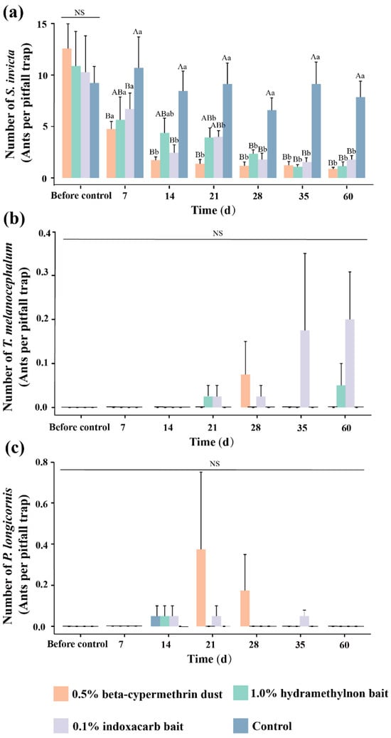 Dynamic changes in ant species (pitfall trap). (a) Number of Solenopsis invicta, (b) Number of Tapinoma melanocephalum, (c) Number of Paratrechina longicornis. The data in the figure represent the means ± standard errors. Following a one-way ANOVA (Tukey’s method), bars with the same uppercase letters indicate no significant difference among treatments with the same pesticide over time (p > 0.05), while bars with the same lowercase letters and “NS” indicate no significant difference among treatments with different pesticides at the same time (p > 0.05).