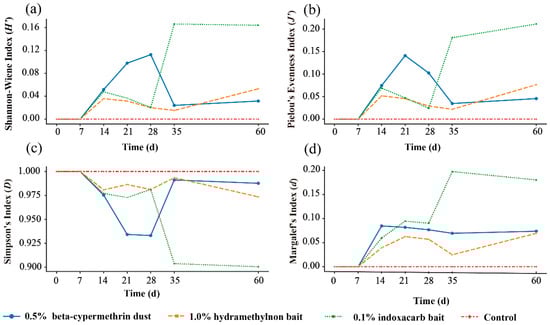 Pattern of characteristic indices changes in the ant community’s response to different pesticide treatments. The data in the chart are the average values of the (a) Shannon–Wiener (H’) species diversity index, (b) Pielou’s (J’) evenness index, (c) Simpson’s (D) dominance index, and (d) Margalef’s (d) richness index.