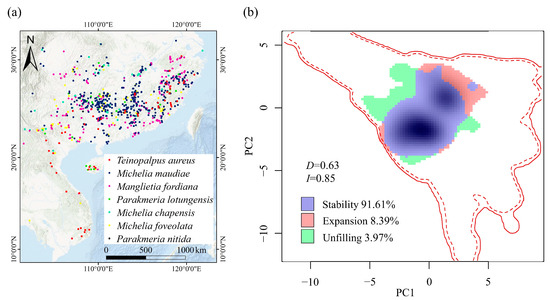 - Broennimann, O.; Fitzpatrick, M.C.; Pearman, P.B.; Petitpierre, B.; Pellissier, L.; Yoccoz, N.G.; Thuiller, W.; Fortin, M.J.; Randin, C.; Zimmermann, N.E.; et al. Measuring ecological niche overlap from occurrence and spatial environmental data. Glob. Ecol. Biogeogr. 2012, 21, 481–497. [Google Scholar] [CrossRef]