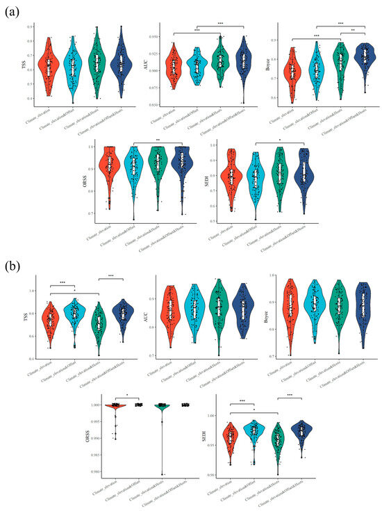 The model performance under four different combinations of predictive variables based on Maxent (a) and RF (b) models. Significance level: * represents p ≤ 0.05, ** represents p ≤ 0.01, *** represents p ≤ 0.001.