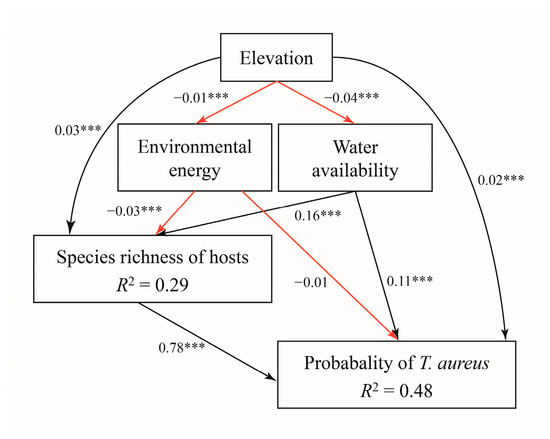 Results of structural equation modeling showing the relative effects of environmental energy, water availability, elevation, and specific host plants on distribution probability of T. aureus. Numbers along the arrows (gray, positive; red, negative) represent standardized path coefficients. Significance level: *** represents p ≤ 0.001.