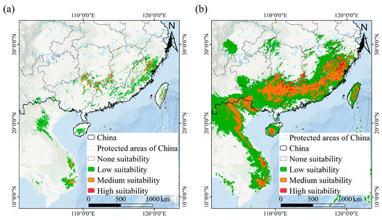 As is well known, T. aureus inhabits high-altitude mountainous regions in southeastern China [31,35]. Therefore, altitude is also an important factor contributing to the current potential suitable distribution for T. aureus. Based on the predicted potential suitable distribution, the altitude niche ranges from 500 to 1500 m (Figure S7), which is consistent with the current field observation records [31,35]. However, compared to the Maxent model, the RF model revealed a significant expansion in the areas of the medium and low suitability zones, and it showed a large area of continuous distribution (Figure 4b), which seemed illogical. Therefore, we believed that the distribution of medium and low suitability zones under the RF model was controversial. Fortunately, the distribution of high suitability zones was consistent between the Maxent and RF models, and it aligned with the current field survey records [28,29,30].