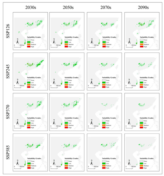 Based on the AOO and EOO values calculated from the occurrence points and predicted potential suitable distribution data, it was suggested that the current status of T. aureus is not threatened. This appeared to coincide with recent reports of the discovery of T. aureus in many mountainous regions over the past few years [28,29,30]. Of course, assessing the threatened status of a species solely based on distribution data is controversial and requires consideration of other information, such as the population size and stability, to yield reliable and persuasive results [45]. While the current potential suitable distribution appears large, it is highly fragmented (Figure 4), likely comprising numerous small populations that are vulnerable to climate change and human disturbance, resulting in extremely low stability. For example, the population of T. aureus hainani Lee, mainly distributed in Hannan Island [25,87], will gradually disappear with climate change in the future (Figure S6). Overall, the potential suitable distribution of T. aureus showed a trend of reduction with climate change, leading to an increasingly threatened level in the future, and gradually moving towards near threatened, vulnerable, or endangered status (Figure 6). Moreover, the vast majority of suitable habitats are located outside protected areas (Figure S5). Therefore, despite the relatively wide distributions, features such as habitat fragmentation, small populations, narrow altitude range, vulnerability to climate change, host plant specialization, and the survival status of its highly dependent host plants, all suggest that its survival status may be more precarious than imagined, so we recommend designating T. aureus as currently vulnerable.