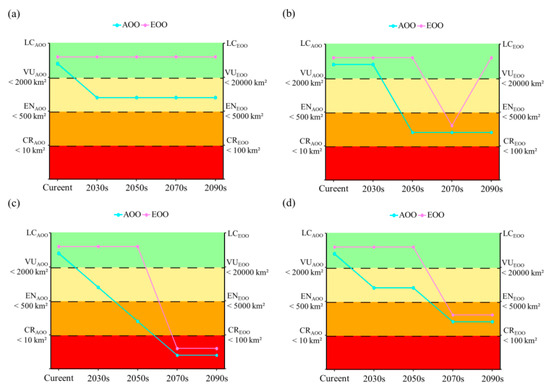 The trend of threatened level for T. aureus in the future based on AOO and EOO under different climate scenarios ((a): SSP126, (b): SSP245, (c): SSP370, (d): SSP585).