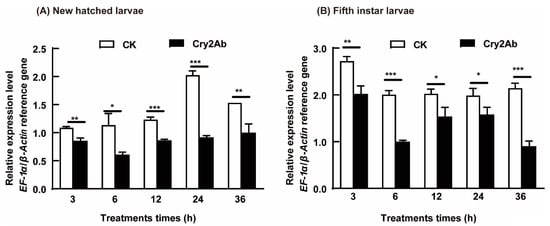 HaV-ATPase C expression in newly hatched (A) and fifth-instar (B) larvae following sublethal Cry2Ab exposure. The standard error of the average from three biological replicates is represented by each error bar. Bars represent the mean (±SD) of three biological replicates. Significant differences at each time point are denoted with asterisks based on Student’s t-test (* p < 0.05, ** p < 0.01, *** p < 0.001, DPSSOFT: DPS9.01).
