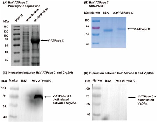 SDS-PAGE analysis of the HaV-ATPase C protein and Ligand blotting analysis of the interaction between HaV-ATPase C and Bt toxin. (A) The prokaryotic expression of HaV-ATPase C protein was confirmed. (B) SDS-PAGE analysis of the purified HaV-ATPase C protein. (C) The interaction between HaV-ATPase C protein and activated Cry2Ab toxin. (D) The interaction between HaV-ATPase C protein and Vip3Aa protoxin.