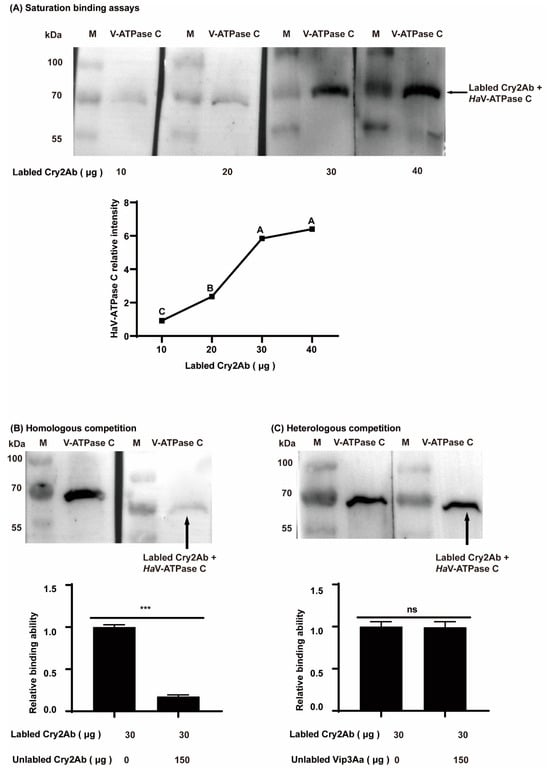 The saturation and competition experiments were conducted using the aforementioned Ligand blotting assay with some modifications. For the saturation binding experiments, 5 µg of HaV-ATPase C protein was immobilized onto a PVDF membrane and incubated with 5 mL of the blocking buffer (5% BSA in PBST solution) overnight. Then, 10, 20, 30, or 40 µg biotinylated Cry2Ab, for a final concentration of 2, 4, 6, and 8 µg/mL, were added to the blocking buffer and incubated for 4 h, respectively. Lastly, this was incubated with 1:10,000 diluted HRP-Streptavidin antibody (Abbkine, Wuhan, China) and 5% BSA for 1 h, washed 5 times for 5 min each with PBST, and then the membrane was subsequently exposed on the Tanon-4600 photographic system. The saturation experiment was conducted in triplicate, and upon reaching a mass of 30 µg, the binding of biotinylated Cry2Ab to HaV-ATPase C exhibited saturation. For the competition assays, 4 pieces excised from each PVDF membrane blot (3 replicates) were separately incubated with 5 mL of the blocking buffer (5% BSA in PBST solution) overnight. Then, they were incubated with 30 µg of biotinylated Cry2Ab toxin protein and 150 µg (5-fold) of unlabeled Cry2Ab toxin protein or unlabeled Vip3Aa toxin protein in 5 mL of the blocking buffer (5% BSA in PBST solution) and incubated for 4 h, respectively. Later, the results were detected as part of the methods of the above saturation experiment. The saturation and competition experimental process described in Zhao et al. was employed [8].
