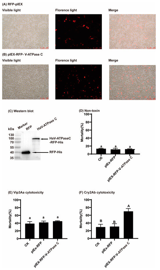 Impact of expression of HaV-ATPase C in Sf9 cells on the cytotoxicity exerted by Cry2Ab and Vip3Aa. (A) Sf9 cells were transfected with RFP-pIEx plasmid (empty vector, control) 24 h. (B) Sf9 cells were transfected with HaV-ATPase C -pIEx-RFP plasmid 24 h. (C) Expression of HaV-ATPase C protein in Sf9 was analyzed by Western blot. (D) The cell mortalities of transfected cells in toxin-free treatment. (E) Cell mortalities were observed upon exposure to 200 μg/mL Vip3Aa protoxin. (F) Cell mortalities were observed upon exposure to 200 μg/mL activated Cry2Ab. Bars represent the mean (±SD) of three biological replicates. The bars with different capital letters (p < 0.01) or lowercase letters (p < 0.05) exhibit significant differences, as determined by the least significant difference (LSD) test using DPSSOFT: DPS9.01.