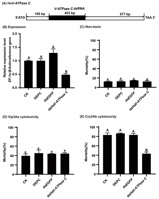 Effects of HzV-ATPase C silencing on the toxicity of activated Cry2Ab and Vip3Aa towards MG cells. (A) The positioning of the dsRNA fragment within the HaV-ATPase C gene. (B) The expression levels of HzV-ATPase C under different treatments. (C) The cell mortalities of different treatments without toxins treated. (D) Cell mortalities were observed upon exposure to 150 μg/mL Vip3Aa protoxin. (E) Cell mortalities were observed upon exposure to 150 μg/mL activated Cry2Ab. Bars represent the mean (±SD) of three biological replicates. The bars with different capital letters (p < 0.01) or lowercase letters (p < 0.05) exhibit significant differences, as determined by the least significant difference (LSD) test using DPSSOFT: DPS9.01.