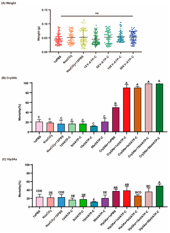 Effect of HaV-ATPase C protein on the larvae weight (A): the toxicity of Cry2Ab (B) and Vip3Aa (C). (A) The effects of HaV-ATPase C protein on larval weight after 7 days of exposure. (B) The impact of incorporating HaV-ATPase C on the toxicity of Cry2Ab towards larvae. (C) The impact of incorporating HaV-ATPase C on the toxicity of Vip3Aa towards larvae. HaV-ATPase C dissolved in PBS, and Bt toxins dissolved in Na2CO3. The values 1×, 5×, 15×, and 50× represent the concentrations of V-ATPase C at 1 time, 5 times, 15 times, and 50 times that of Bt toxins. The mortality values were expressed as mean ± SD. The ns indicated no significant difference among the effects of HaV-ATPase C protein on larval weight after 7 days exposure. Bars represent the mean (±SD) of three biological replicates. Bars labeled with different capital letters indicate significant differences (p < 0.01) based the LSD test conducted using DPSSOFT: DPS9.01.