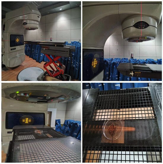 Linear accelerator radiotherapy systems are commonly used devices for treating malignant tumors, with the advantages of targeting tumors and high-precision avoidance of normal tissues [26]. Varian Medical Systems have a long and rich history as pioneers in the oncology field. The Varian Clinac linear accelerator, which has demonstrated effective therapeutic outcomes in the treatment of breast cancer, prostate cancer, meningioma, lung cancer, melanoma, and total skin electron therapy, was employed in our investigation [27,28,29,30,31,32]. In 2017, researchers showed that the Varian Clinac 21EX linear accelerator can utilize ultrahigh dose rates for mouse irradiation and achieved excellent dosimetric properties at doses exceeding 200 Gy/s [33]. The Varian Clinac 23EX linear accelerator located at the Department of Radiotherapy, the First Affiliated Hospital of Anhui Medical University, Hefei, China, was used in this study as a radiation source for X-rays to irradiate the male pupae of Ae. aegypti mosquitoes due to its convenience and accessibility. This Varian Clinac 23EX linear accelerator can offer two options for photon beams: −6 MV and 18 MV. Its operating platform enables precise and reproducible positioning, along with dynamic control and timely beam opening, to minimize radiation exposure.