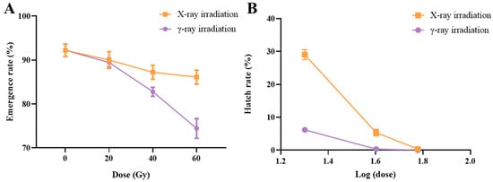 Effects of X-ray and γ-ray irradiation on the emergence rate (A) and egg hatch rate (B) of Aedes aegypti. The error bar indicates ± SEM. (Pearson chi-square and Bonferroni tests.)